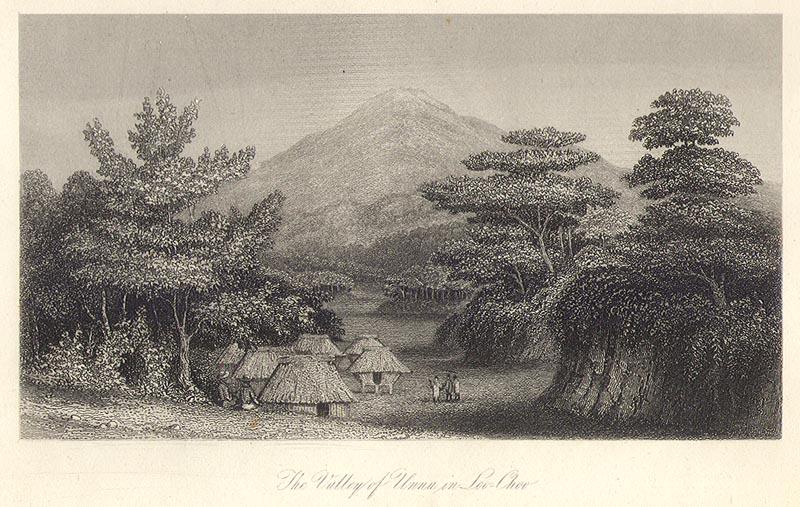 The frontispiece is an Okinawan scene, the "The Valley of Unna in Lew Chew" drawn by Taylor. Two minor variations in the frontispiece in the first edition have been recorded. Type A has the lettering immediately under the image with the artist's name (B. Taylor) (positioned on the left) and the engraver's name (positioned to the right). Type B does not have this lettering. The book is a narrative of Taylor's two and 1/3 year world travels of over 50,000 miles. The journey spanned most of the European countries, the Nile to Central Africa, Palestine, Asia Minor, India, China (twice), Okinawa and Japan. Taylor tied up with the Perry Expedition to Japan in Shanghai by actually joining the Navy as an "officer of very moderate rank" (p 361). During the expedition, Taylor traveled on board the Susquehanna as the personal clerk to Captain Buchanan. Taylor, America's most popular literary journalist of that period, accompanied the expedition and recorded the military and diplomatic maneuvers by which Perry gained access to Japanese officials. He was not on the entire expedition but was on the expedition to Japan during May to September, 1853 time period which included a visit to Okinawa, the delivery of the President's letter and the return to Hong Kong and Macau. After smoking a little opium in Canton, Taylor terminated his brief career as a Naval Officer in September of 1853 and headed home on commercial vessels. The Perry Expedition portion of the book spans approximately one-fourth of the book (ca 140 pages). Taylor's account of the visit to Okinawa is perhaps one of the most informative (outside the original Narrative of the Expedition) account of life in Okinawa in the mid-19th century. His first observation, on viewing the Island from sea on May 27, 1853 was: When the next morning dawned, bright and clear, I though I had never seen a more lovely landscape than the island presented. (page 366)The Loo-Choo account (pages 364-388) given by Taylor touches on many different aspects from geography, cultural properties, government, local customs, structures and living conditions, commerce, diet and agricultural practices, to name just a few.