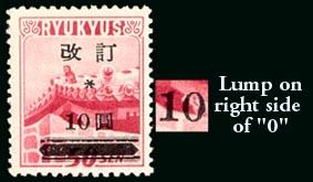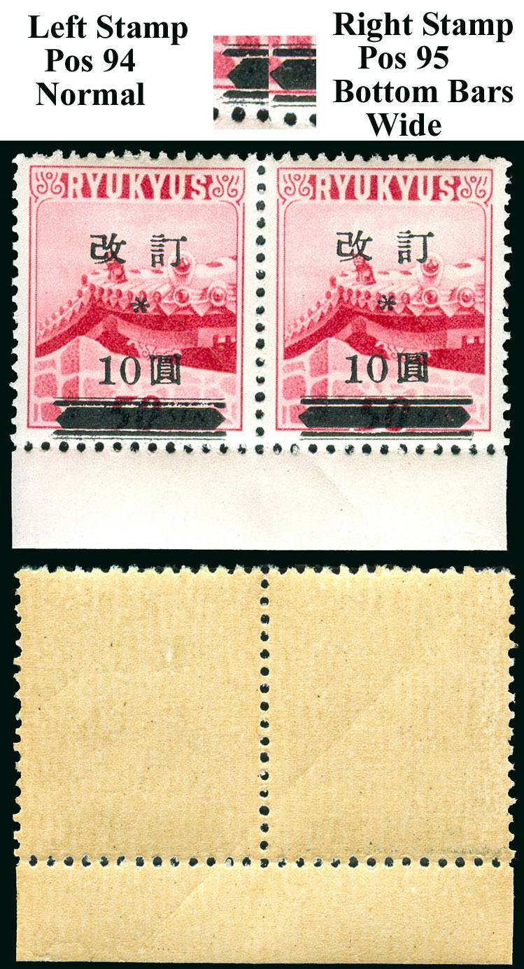 9p/8p (Vertical Pair) Pair 9p on top and 8p on bottom - nine (9) in a sheet Inscription Block Lower right block of 6 or 10 with inscription For an excellent detailed discussion of the Ryukyu Islands 10 yen Kai Tei overprint series you can consult, From the Dragon's Den, Volume 14:2, (Whole No. 45) April, 1982. FTDD is the official publication of the Ryukyu Philatelic Specialists Society, LTD.