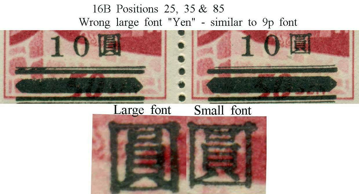 There is one position in the 16B series that looks like a stamp from the 16 (2nd printing) series. That is position 96 where the "10" is narrowly spaced. Standing alone, this stamp could well be classified as a 16. To distinuish it, you need to examine the downward stroke of the second character of the "Kai" as it goes under the first character. In the 16B the stroke is short. In the 16 series, the stroke is much longer.