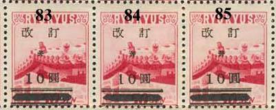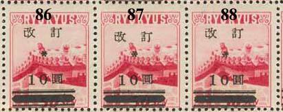 Forgeries. By the term forgery, I am referring to a stamp that was made with the intent to defraud the postal service of revenue. They are manufactured and used without paying the postal service. There are well documented forgeries of the 10 yen Kai Tei overprint. Two such forgeries are called the Gushikawa forgeries. These are discussed in From the Dragon's Den, Volume 15:2, (Whole No. 49) April, 1983. The overprints appear different than the genuine 16, 16A, 16b and they can easily be confirmed as forgeries if they have part of Gushikawa cancel (1953) as show below. Forgeries are in demand. Most collectors do not have them. Consider yourself fortunate if you have a 16 series forgery in your collection. Two types of the Gushikawa forgery have been recorded (See FTDD 15:2).