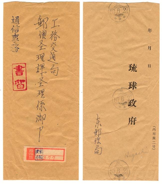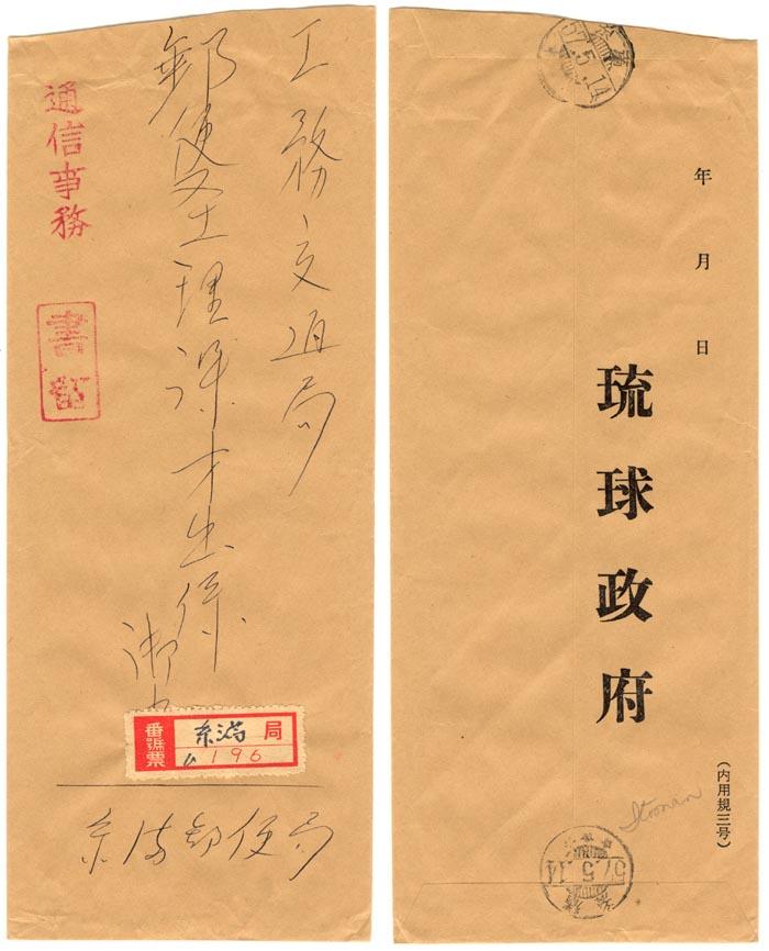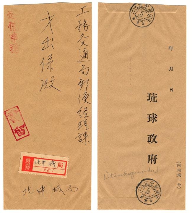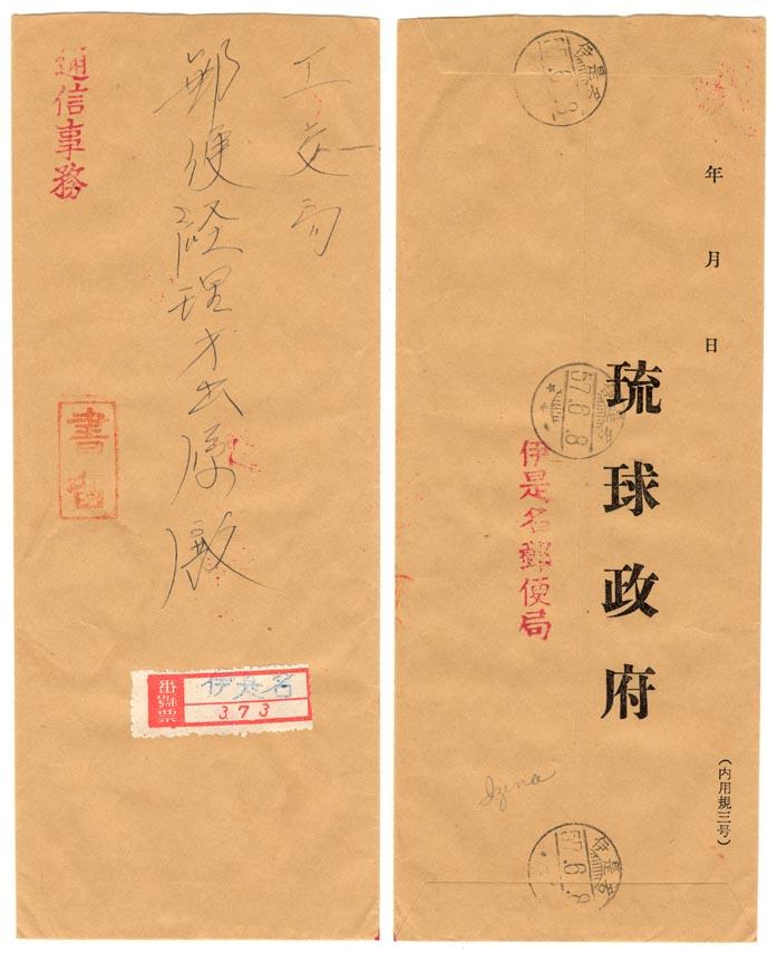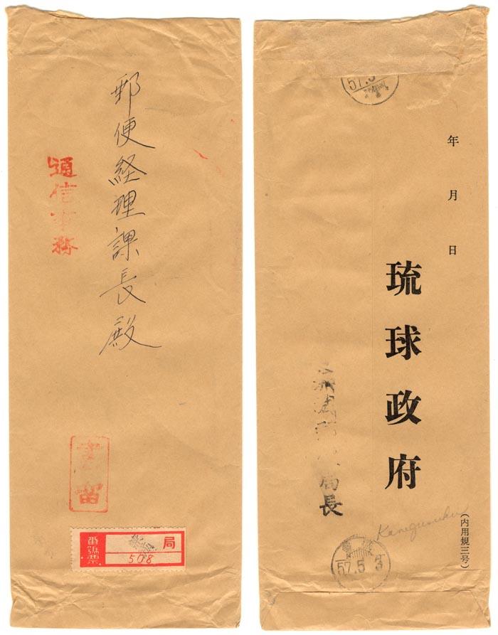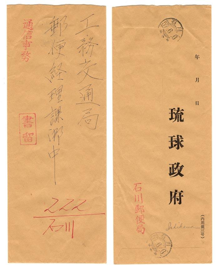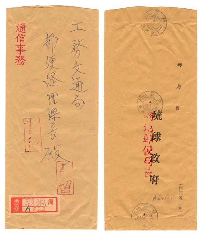 The basic envelope used for these covers is discussed in Volume 11, No 2 (July 15, 1979), pages 46-51 of From the Dragon's Den, the official publication of the Ryukyu Philatelic Specialist Society, LTD. The covers on this page are shown at Figure 3 and Figure 4 of the RPSS article.