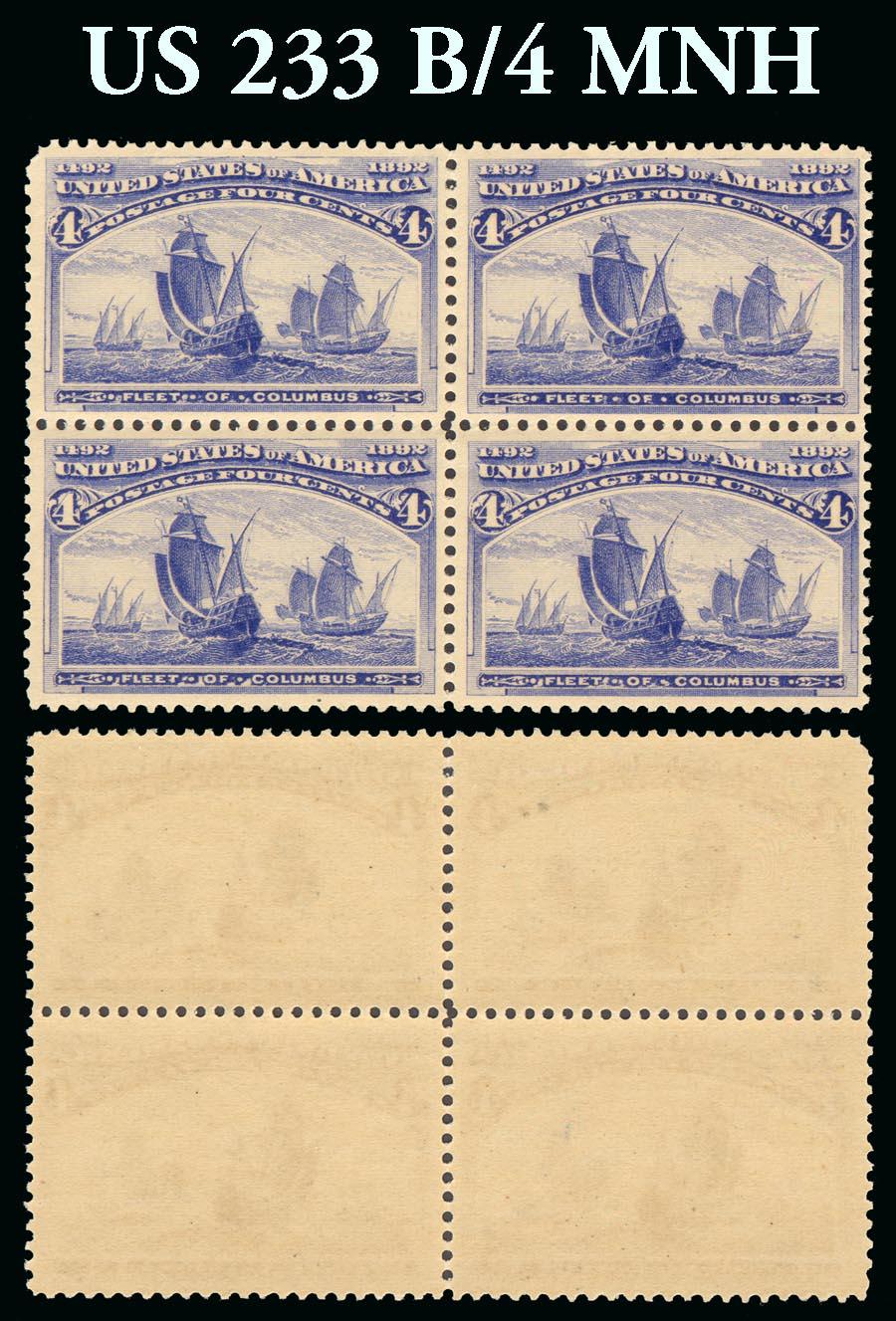| This is a block of 4 of Scott 233, the 4c stamp from the 1893 Columbian Exposition issue. All stamps are mint, never hinged. Good crisp color and nice gum. The upper left stamp has a rounded corner and the bottom left stamp has a clipped perf at the bottom left side. |