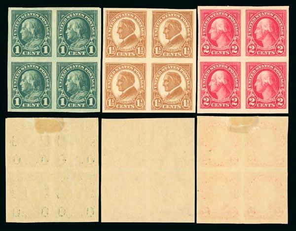 United States 575-7 B/4 - Flate Plate 575, 577 - Top 2 Stamps, Mint, Hinge Remnants 576 Mint, Never Hinged This is a block of 4 set of Scott 575-7, 1923-5 imperforates. Flate plate (19 1/4 x 22 1/4 mm) printing. The top two stamps of 575 (1c) and 577 (2c) are hinged with hinge remnants and have light ink offset on the gum. The 576 (1 1/2c) is mint, never hinged. |